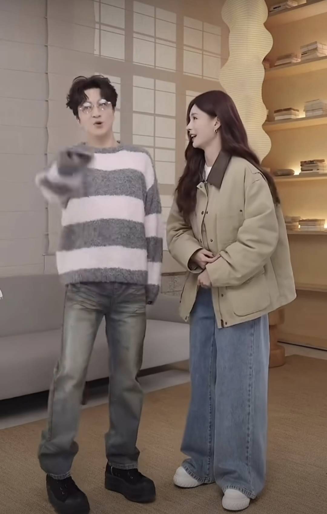 薛之谦的“魔童式”整活堪称名场面。试衣环节,他瘫倒在地装死,吐槽“好想死哦”,还要求化妆师“真打”拒绝假动作;模仿模特浮夸台步时,他自创“僵尸舞步”,甚至试穿女装制造反差笑点。更令人捧腹的是,他自曝“放屁”糗事,尴尬道歉称“喝咖啡容易有反应”,被沈梦辰调侃“抽象派鼻祖”。这场毫无预演的互动,让直播间秒变欢乐场。